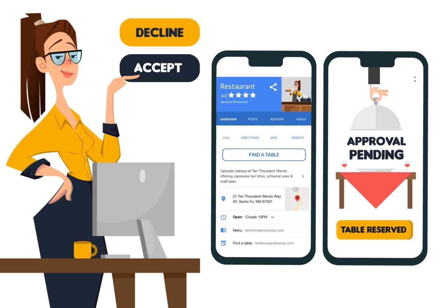 Accept or Decline table reservation request in one click and manage from the admin panel or mobile app. Send table reservation confirmation to the customer via email and SMS.